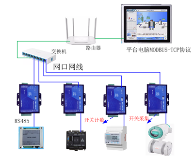 2)平台电脑使用MODBUS-TCP协议,现场网口模块的485转MODBUS-RTU与各仪器仪表对接通讯