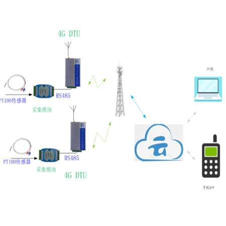 2、系统应用说明 1)现场无线模块使用的是4G全网通DTU模块,温度采集为PT100的采集器。共计1个模块采集6路温度 2)上传数据为:DTU编号+ABC三相温度+采集时间 3)DTU和服务器网络协议:HTTP协议 4)DTU主动485采集温度模块按6S一次定时上传给服务器,服务器响应一个OK 5)现场DTU和温度模块通讯故障时,各通道附值为0上传。 6)DTU有防死机看门狗处理机制 |