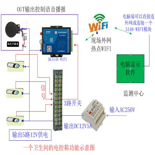 1)上图只画了一个卫生间的检测设备的功能示意图。 从图上可知,输入交流电(前面还可以加一个空开),经过电源转换后输出DC12V 12V分出来10路接到集线端子排上,这10路供电分别给8个传感器和语音器和WIFI数传模块供电。 8路传输的开关号也经过集线端子排然后接入WIFI数传模块的开关采集端子上。 WIFI数传的OUT输出去控制语音板的控制线播报。